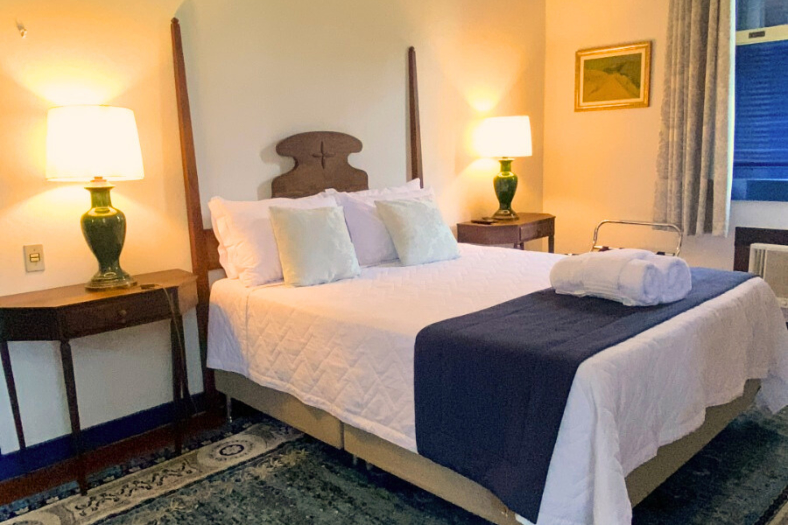 A Suíte Colonial II acomoda até 4 pessoas e oferece um ambiente confortável e acolhedor. Conta com uma cama de casal e duas camas de solteiro, ar-condicionado e cafeteira, garantindo praticidade e bem-estar durante a hospedagem. Bem localizada, oferece o equilíbrio perfeito entre conforto e comodidade.