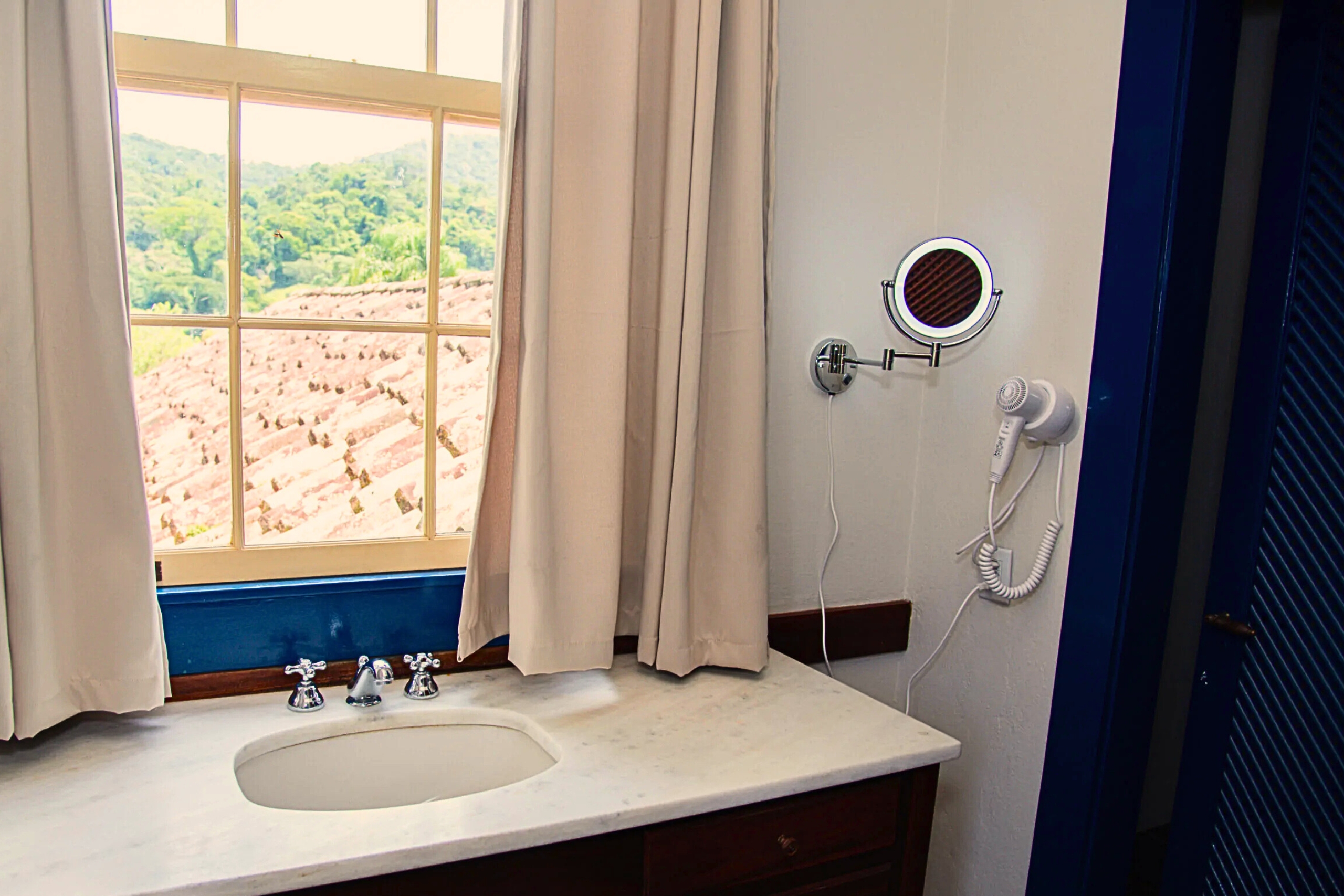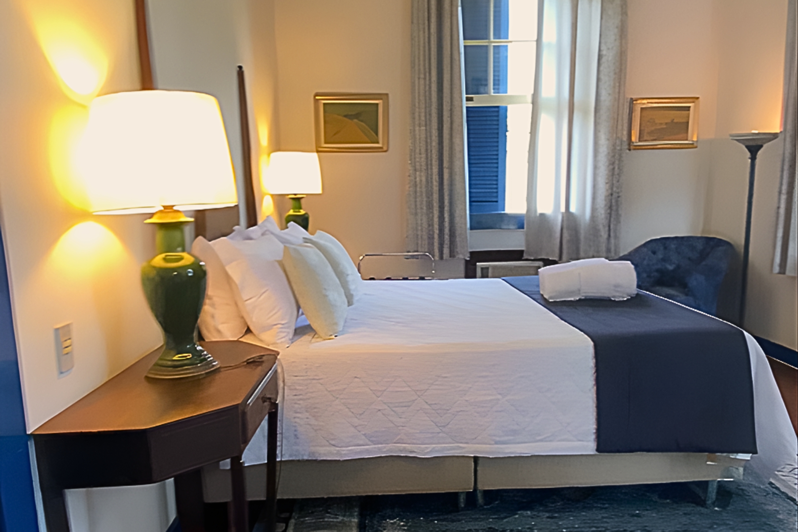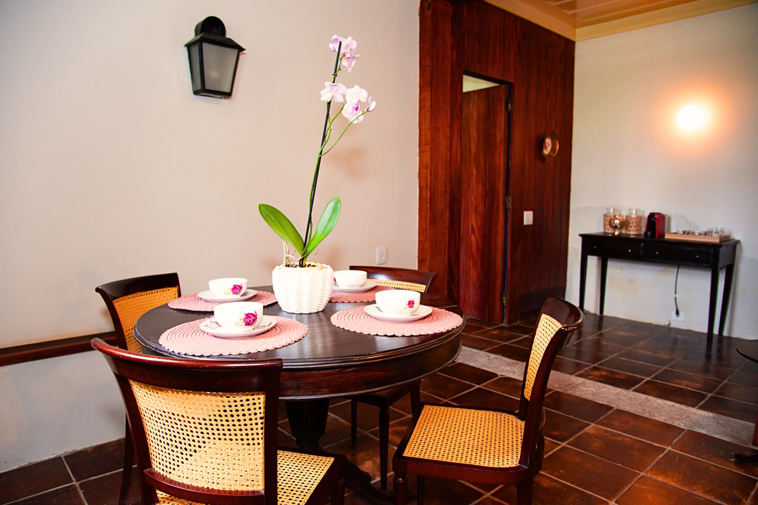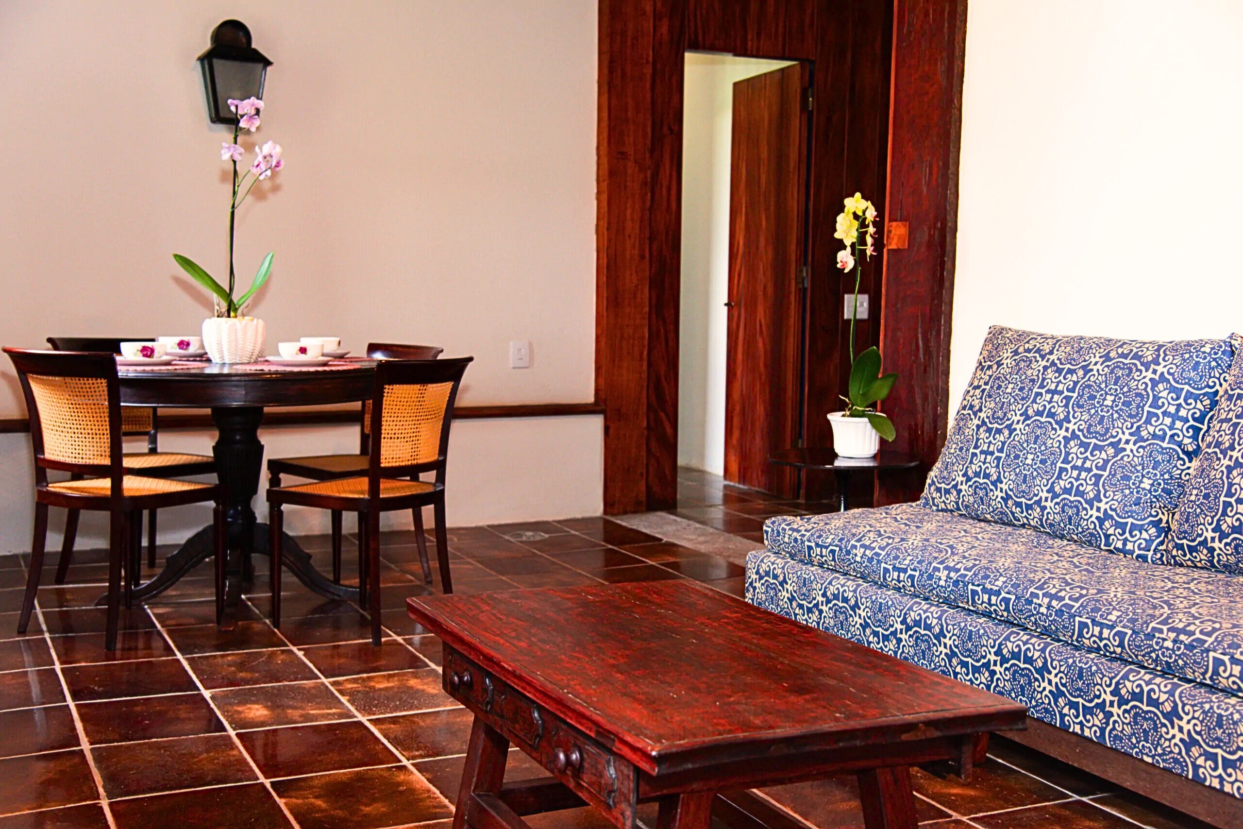 A Suíte Colonial I acomoda confortavelmente até 3 pessoas e oferece uma localização privilegiada, ao lado da recepção. Conta com uma cama de casal e outra de solteiro, além de uma agradável sala de estar, equipada com mesa, cadeiras e sofá, proporcionando mais conforto e praticidade durante a estada.